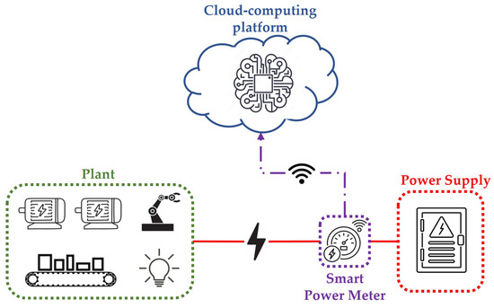In this study, a typical scenario, shown in Figure 1, for condition monitoring of industrial loads is considered. More specifically, in such a scenario, an industrial plant consisting of electrical loads, e.g., machine tools, electrical motors, robots, or lights, characterized by a periodical power consumption, is fed by a centralized power supply. The aggregate power consumption of the electrical loads is measured by means of a single power meter, which transmits the measured time-series data to a cloud-computing platform. Finally, a software application implemented on the cloud-computing platform processes the collected time series to perform both condition monitoring and anomaly/novelty detection of the industrial plant.