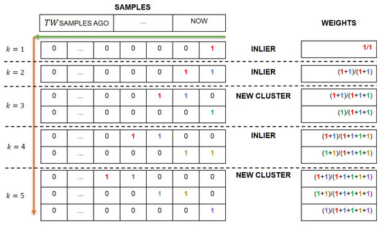 Instead, the Gaussian weights are updated according to the procedure depicted in Figure 3. To each cluster, a time window of samples is associated. Thus, referring to Figure 3, a matrix H of size is constructed, where denotes the current number of clusters. The last column of H is referred to as the current sample in time instant . When a new sample is acquired, if it belongs to the i-th cluster according to the z-score (1), 1 is placed in the last column of the i-th row, while in the last column of all the other rows is placed a 0. However, if the sample does not belong to any cluster, a new row is added to the matrix H, defining a new cluster. In both cases, the other columns of H are shifted by one position to the left, and the first columns are canceled. Note that, initially, the matrix H is defined by a single row () with zero elements and each new row has zero elements except for the last column. After this procedure, the weight of each cluster i at the sample k, is calculated with the following formula: