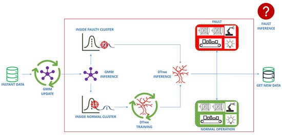 To address the above issues from conventional GMMs, this paper presents a novel method for the online CM of electrical industrial loads, which is able to identify their regular/normal operating modes, detect anomalous working conditions, and determine new operating modes by using an active power consumption data stream. The proposed solution is essentially an online data-driven algorithm combining automated Gaussian mixture model (AutoGMM) [25,26] and decision tree (DTree) [27,28].