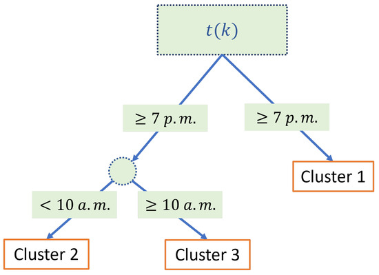 Once the parameters of AutoGMM have been updated, anomaly and novelty detection are performed, as reported in Figure 4. A DTree is trained to predict the normal cluster of membership, i.e., the cluster to which the sample k should belong based on its arrival time . The DTree is a classifier expressed as a recursive partition of the instance space. It is based on a hierarchical tree structure, which consists of a root node, branches, and inner and leaf nodes [30]. The latter represent the possible outcomes within the space. In this work, the adopted training criteria for the DTree is the Gini index and the chosen value of the complexity parameter which regulates the overfitting is 0.1. The DTree is trained only using samples belonging to normal clusters, i.e., clusters that have a weight , where is a user-defined threshold. By training the DTree using only samples belonging to normal clusters, a correlation between the sample arrival time and the active power of normal clusters is registered. For instance, a diagram of a trained DTree with three leaf nodes (the predicted clusters) showing the time-based inference of the expected clusters is reported in Figure 5. As can be seen, the input of the DTree is the arrival time of the new sample while its output is the expected cluster of membership of the new sample. It is worth highlighting that the training algorithm of the DTree also exploits the active power measurements to adaptively change the expected clusters during the operation of the plant.