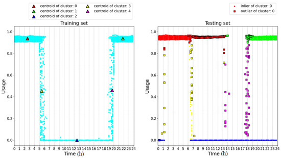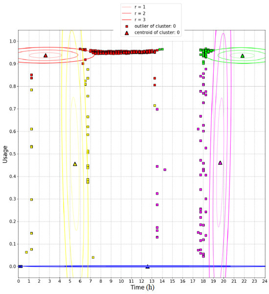 The left-hand side of Figure 7 shows the training dataset used to train the 2D GMM and the centroids of five clusters defined a priori. The right-hand side of the figure shows the results achieved on a testing set which includes anomalies with respect to the training set. In this figure, the circles represent samples recognized as inliers while the squares represent outliers. The color of the outliers is inherited from the cluster with the lowest Mahalanobis distance. As can be seen, the algorithm fails in recognizing as outliers the blue samples collected in the time range 0–1.5 h. The same error occurs with the blue samples collected in the time range 20–24 h. This can be explained by observing Figure 8, which illustrates the 2D probability density functions of the clusters trained with the training dataset. For each cluster, three ellipses denoting Mahalanobis distances from the centroid equal to 1, 2, and 3 are drawn. In particular, the blue cluster spans the whole time range. This is due to the intrinsic assumption that the GMM is dealing with normal distributions of the inputs, while in this case the distribution of the time feature is strictly rectangular, as shown in the training set. This incongruence leads all the clusters to over-range the time intervals in which the samples have been collected, as can be observed by comparing the time extension of the clusters in Figure 8 and the time ranges of the samples of the training set shown in Figure 7.