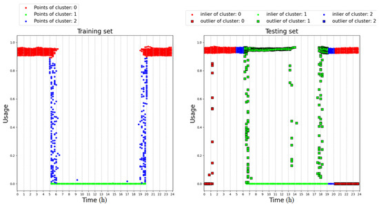 Figure 9 shows the results obtained by means of the proposed algorithm on the same dataset and adopting a predefined number of clusters. Only three clusters are chosen since, in this case, only the active power is used as an input for the GMM. The figure on the right shows how the DTree correctly recognizes as outliers the samples collected in the time ranges 0–1.5 h and 20–24 h, thus overcoming the performance of the conventional 2D GMM. In this case, the effectiveness of the proposed algorithm is ensured by the fact that the DTree learns a relationship between the clusters of the GMM and the arrival time of the samples, overcoming the assumption of the normal distribution of the time feature, which is intrinsic in the 2D GMM.