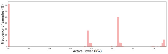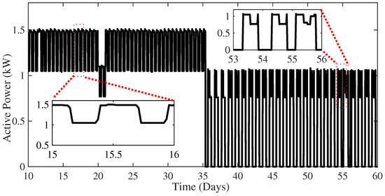 The full capability of the proposed algorithm in detecting outliers and novel operating modes is demonstrated by analyzing the results achieved on the experimental dataset. In particular, active power time series collected for a year and a half with a sampling time of 30 min have been collected and processed by the proposed algorithm. Figure 10 shows the frequency distribution of the active power consumption of the whole dataset. Note that different levels of active power over the observation period are registered. Figure 11 shows the active power time series for 50 days. Note that at day 20 an anomaly in the power consumption with respect to the previous and following days can be observed. Another anomaly can be observed at day 55. It is also important to draw attention to the sudden change in the plant’s operating modes starting on day 36. The zoomed figures shows the daily periodic working cycles of the plant.