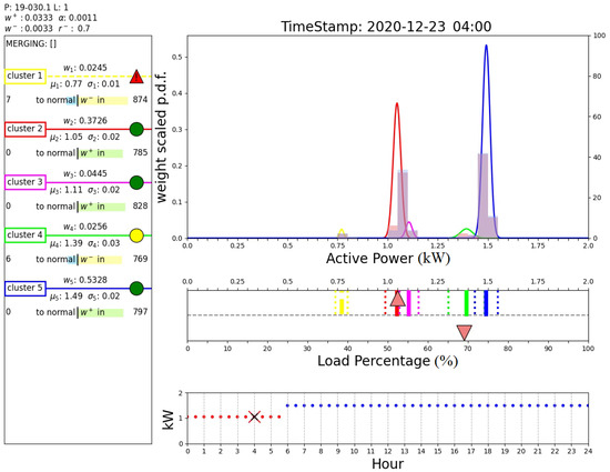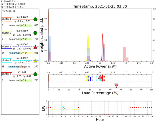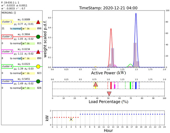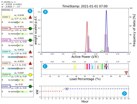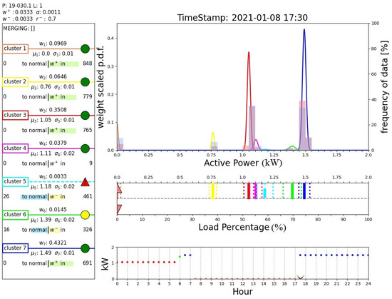 Figure 12 shows the output of the proposed algorithm at 31 d 6 h 30 min of the time series. Above box A, the plant identification number and the values of the main parameters of the algorithm are reported. Box A summarizes the parameters of all the active clusters (weight, mean, and standard deviation). Additionally, for each cluster the number of consecutive samples required to normalize or to suppress the cluster is reported. Normal clusters are denoted with a continuous line and a green circle. Previously normalized clusters with a weight lower than are denoted with a continuous line and a yellow circle. Clusters which have never been normal are denoted with a dotted line and a red triangle. Box B reports the probability density functions with the related weights computed according to the proposed AutoGMM reported on the left y-axis. Additionally, two different histograms are shown, equivalent to the histogram reported in Figure 10. The red histogram is related to the whole data collected up to the current sample, while the blue histogram refers to data collected in the last 24 h. Box C reports the cluster distributions. For each cluster, the centered line denotes the cluster mean while the dotted lines delimit the inlier range of the cluster according to its standard deviation. The orange triangle in the upper part of the box denotes the active power of the current sample. The orange triangle in the lower part of the box represents the relative percentage power of the actual sample with respect to the maximum power ever registered. Finally, box D reports the active power predictions over a day provided by the DTree.