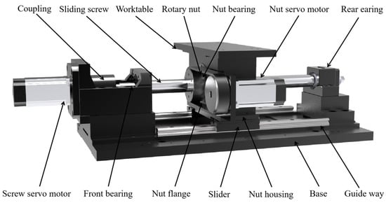The dual drive sliding feed system is illustrated in Figure 1. The main difference between this system and the traditional feed system is the addition of a motor to drive the nut. During operation, the screw and the nut rotate simultaneously, and the worktable obtains displacement through the velocity difference between the two. The distinction between the dual drive sliding feed system and the existing dual drive feed system lies in the replacement of the ball screw with a sliding screw.