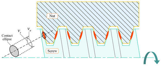 The contact part of the screw and nut is obtained as the dual drive sliding feed system is not rigid. According to the Hertz contact law, the contact surface of the screw and nut will produce a small contact area under the normal driving force, and its shape is an ellipse, as shown in Figure 2. The red area in the figure indicates the contact area between the screw and the nut, and the circumferential speed of the screw surface is proportional to the distance to its axis. Similarly, the circumferential speed of the nut surface is proportional to the distance to its axis. Pure rolling occurs only on two lines in the contact area. Therefore, relative sliding in opposite directions, called differential sliding, occurs at the remaining positions. The frictional moment caused by differential sliding is due to the local shear stress in the contact area. Therefore, the differential sliding friction torque can be expressed as [16]: