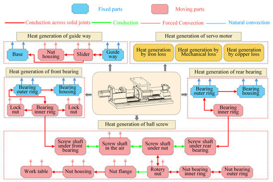 In the case of the feed system, a significant basis when performing a simulation of thermal characteristics is to establish accurate thermal boundary conditions. The heat transfer coefficient includes heat generation, the TCR between components, and the convective heat transfer coefficient. Existing studies have revealed that the thermal error of a feed system is influenced by external and internal heat sources. External heat sources mainly include space temperature and previous environmental memory. It is difficult to carry out a quantitative analysis. Precision machining processes mostly occur in a constant temperature and humidity environment, so such heat sources are not considered in this paper. The internal heat sources mainly include motors, bearings, screw nut, and guideways. To accurately establish the thermal behavior model of the system, it is necessary to clarify the heat generation and heat transfer mechanism. The heat generation and heat transfer mechanism of the dual drive sliding feed system are shown in Figure 3.