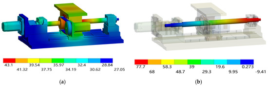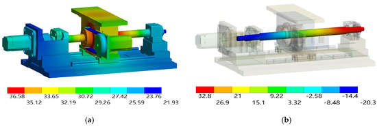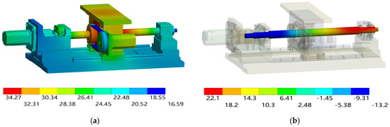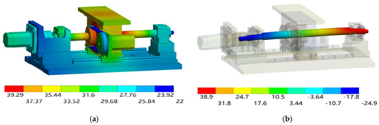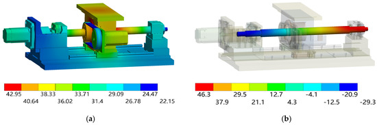 Temperature field and axial deformation under the operating condition IV. (a) Temperature field distribution. (b) Axial deformation distribution of the screw shaft.