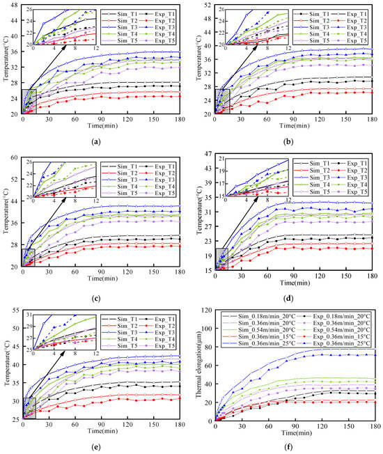 As shown in Figure 10, along with the increase in the system running time, the temperature of each part, as well as the axial thermal elongation, will increase. Moreover, the temperature difference at T3 is large relative to the other temperature measurement points. The reason is that T3 is the result of the superposition of two major heat sources, and the sliding screw produces more heat. As shown from the experimental and simulated comparison data for each temperature measurement point in Figure 10, the values measured in the experiment are lower than the simulation values. The reason is that the temperature sensor is attached to the component surface. There is a large thermal contact resistance, which affects the accuracy of the temperature measurements. In contrast, the deviation in the temperature measured at T4 is smaller because the temperature at T4 was measured by an infrared thermometer. There was no thermal contact resistance between the sensor and the component. In addition, this experiment used air conditioning for temperature control. Moreover, the experimental environment space is small, and the airflow was disrupted during the experiment. As a result, the accuracy of temperature collection was compromised, causing fluctuations in the experimental temperature measurement data. Comparing the characteristics of the temperature rise for each operating condition in Figure 10. It can be seen that the location with a higher temperature at the end has a faster temperature rise at the beginning due to its higher heat generation. However, the temperature rise at T5 was slower than at T3 and T4. The reason was that the T5 was not a heat source, and temperature rise could only be realized through heat transfer between components. Therefore, the temperature at T5 was also easily affected by the environment and other heat sources. So, the error between the experiment and simulation was more significant.