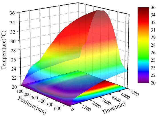 Thermal simulation can obtain more operational process data than experiments can, thus providing insight into the thermal characteristics of the feed system. Operation condition I is taken as an example based on the transient thermal analysis of the feed system. The temperature field of the screw shaft with respect to time and position changes is determined. This is shown in Figure 11.