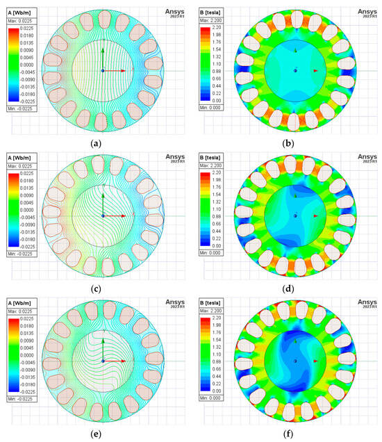 Figure 2c,e,g show how the rotor flux path changes due to the fields that eddy current generated when the speed varies from 2910 rev/min to 2700 rev/min, where slip varies between 3% and 10%. Consequently, the flux path becomes narrower while the flux amplitude increases, and eventually, the rotor back iron starts to saturate, as shown in Figure 2b,d,f,h.