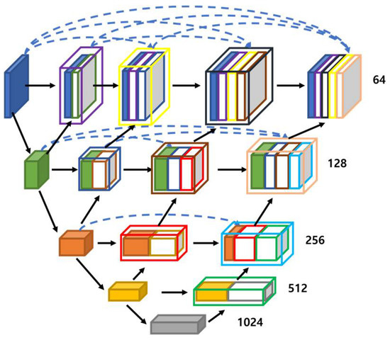 The UNet++ model features a nested and dense skip connection, which overlaps features for each layer and has a high number of channels to enhance the connection to each layer. This aims to reduce the difference in the feature-related information between the encoder and decoder. Although UNet++ also exhibits good performance, the number of parameters increases to contain all the corresponding information. UNet3+ features a structure to contain all the feature information of the entire input, as shown in Figure 3.