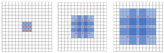 Studies on the DeepLab network suggest that semantic segmentation should infer situations of various sizes [8,9,10]. DeepLabv1 v2 has raised doubts about regarding the process of extracting image features and restoring the downsampled image to its original size. Based on this suspicion, location information could be lost in the case of a structure without a skip connection, such as UNet, and the encoder–decoder structure was eliminated. In DeepLabv2, in place of the encoder–decoder structure, the results were derived through atrous convolution, as shown in Figure 4.