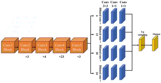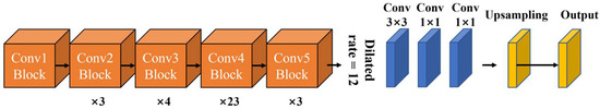 Atrous convolution was used for two reasons. First, it increases the receptive field. Second, various sizes can be responded to by adjusting the dilation parameters. This can be exploited to reduce the number or size of the pooling layers to cover a wide receptive field with the same number of filters, thereby reducing the overall number of parameters. The DeepLab model uses atrous convolution. The structure of each model is shown in Figure 5 and Figure 6, respectively.