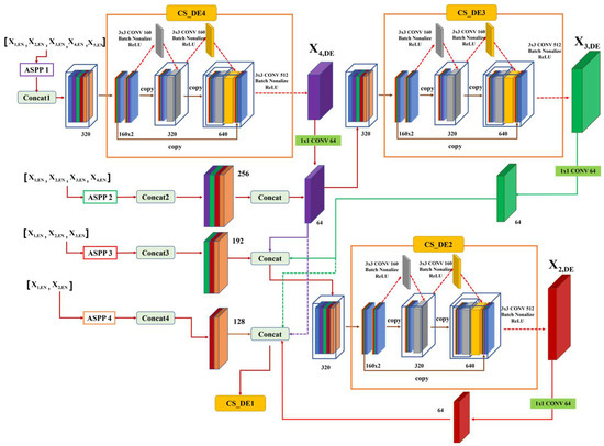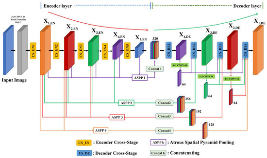 Figure 13 shows the structure of the proposed decoder. The first layer of the decoder used only the feature maps of the ASPP block of the encoder layer. The next decoder layer performed the cross-stage using the feature maps that concatenated the feature maps of the previous decoder layer calculated through bilinear interpolation and the output feature maps from the ASPP of the encoder layers.