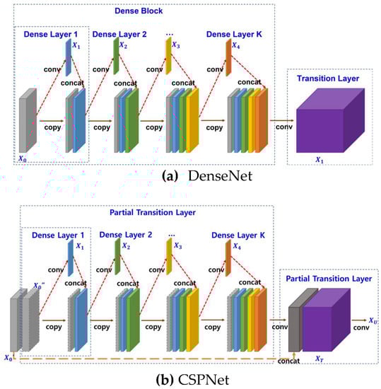 The CSPNet, which was proposed to solve this problem, adopted the convolution method by dividing the output of the previous layer, as shown in Figure 9b. Its advantage is that it can be applied without changing the backbone structure of most classical CNNs. Equations (1) and (2) are used to update the gradient during the layer feedforward calculation and backpropagation of the DenseNet and CSPNet, respectively.