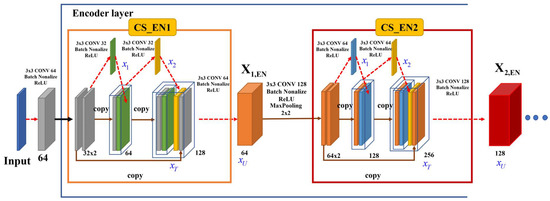 In Figure 8, CS_EN1 represents the cross-stage block of the first encoder layer and represents the output of this block. The input image feature map was divided into two 32-channel feature maps and calculated in the cross stage. The number of convolutions in the cross-stage block can be determined by the designer or the user as a hyperparameter.