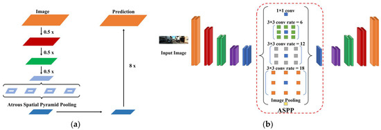 However, low-resolution feature maps lose the details of valid information, such as boundaries in the field of semantic segmentation. In addition, the same object can exist at different sizes in the image. To compensate for these problems, an ASPP structure that can be applied when classes exist in different sizes in an image was proposed. Figure 11a shows the ASPP applied to the classical CNN and Figure 11b shows the ASPP applied to the encoder-decoder structure.