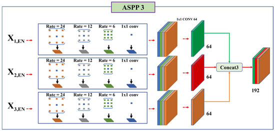 where denotes the j th encoder layer; [] denotes a concatenation combination; and is a convolution operation. Using Equations (5) and (6), the output for the ASPPs proposed in this study is expressed as Equation (7):