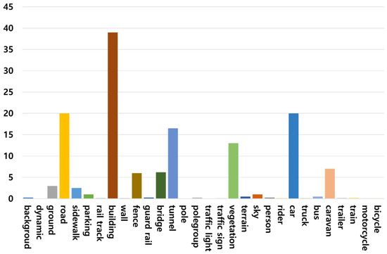 We evaluated our model with only fine annotated cityscapes data and used 2975 training, 500 validation, and 1525 test images. The results can be found in Table 7. The results in Table 7 indicate that our model has superior performance compared to other models in seven classes. Additionally, the average mIOU of our model across all classes is about 11% better than Deeplabv3. Significantly, the classes with excellent results are those with low frequency, as shown in Figure 16. Therefore, the proposed model has an excellent performance in the field using small training data. Figure 19 shows the results through the dataset of cityscapes. Unlike other models, we show the results of finding detailed features. As an example, extracting features for thin columns shows higher performance than other models.
