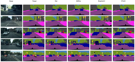 Figure 17 shows the visualization results of each model using the KITT-360. In Figure 18, the original images contain simple classes, and all models exhibited stable performance in the visualization results. Figure 18 shows the visualization results with more complex classes than those in Figure 17. As shown in Figure 18, the proposed model was superior to the other models. Numerous false positives were confirmed in the case of DeepLabv3 owing to shadows in images containing several classes.