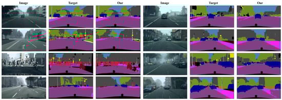 In this experiment, we evaluated the model’s performance on noisy data. Foggy and Rain Cityscapes is a dataset that composites fog and rain over natural scenes. The images are rendered using the images and depth maps from Cityscapes [33]. Table 8 and Table 9 show the performance comparison of each model on the Foggy and Rain Cityscape dataset, respectively. In Table 8, we can see that the proposed model performs better than other models in the nine classes.