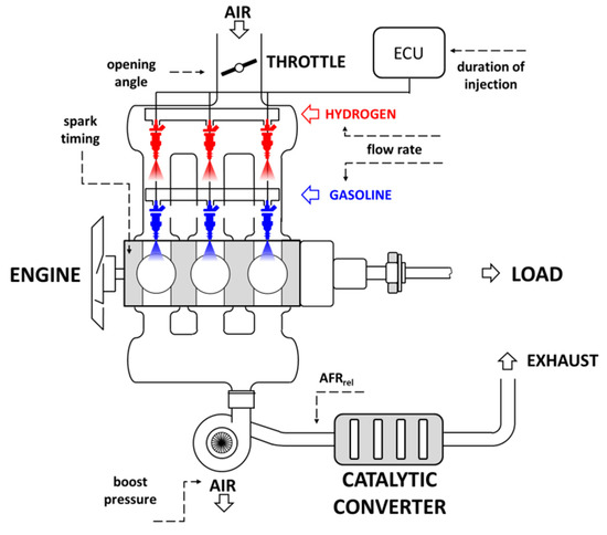 A small-size passenger car was considered for the present study. It is powered by a 600 cc petrol engine that delivers 40 kW peak power. The electric version of the vehicle features a 41 kW electric motor, and the 17.6 kWh battery ensures a 130 km/h top speed and 125–135 km range. An initial evaluation found that the target of 40 kW peak power and around 100 km range could be obtained with H2 fueling [23] by adding a 30 L container alongside the petrol tank. In this way, the vehicle is completely compatible with the current fuel supply chain and would also be prepared for a future zero-emission scenario. Moreover, if the liquid fuel tank is replaced with gas containers, autonomy would increase to over 170 km, which is close to the foreseen maximum distance between H2 refilling stations [25], and ensure a slight margin so as to alleviate range anxiety. Figure 1 shows the overall layout for the studied power unit. Apart from the main control parameters that were included in the model, it also shows the added H2 injectors; it should be noted that the actual location of these metering valves was considered close to the intake valves (i.e., fitted at the end of intake runners). Only the case of port fuel injection was considered, given its easier implementation, with a reduced number of added components.