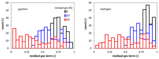 Figure 3 shows the distribution of f(xr) values obtained starting with the same set of 200 random numbers, when changing the residual gas fraction from 5 to 10 and 20%. Evidently, a higher percentage of residual gas results in more consistent reduction in laminar flame speed (low values of function f). It is interesting to note that for both fuels, a wider distribution is predicted at an increasing concentration of residuals. Another important observation is that the effect is different for H2 compared to gasoline; the effect would seem to be less significant for the gaseous fuel, especially at low values of xr.