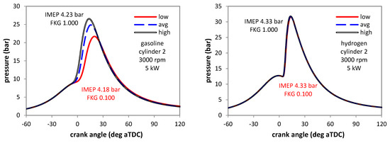 A condition of 3000 rpm and 5 kW brake power was arbitrarily chosen for these simulations. Throttled operation was predicted for both fuel types. After an initial step in which the PID controllers were active, the waste gate opening, throttle angle, injection duration, and spark timing were identified for stable operation with the mean FKG and no fuel injection effects. Afterwards, simulations were performed with the fixed control parameters and changing FKG, injection duration, and DEM within the limits imposed in the CCV sub-models. This was done so as to easily identify the effect of induced variability. Figure 4 illustrates the effect of varying the FKG parameter on in-cylinder pressure. A clear difference between gasoline and hydrogen is evident. If, for the liquid fuel, the change resulted in peak pressure variations of up to 5 bar, for H2, the variation was slightly over 0.2 bar. This is directly correlated to the laminar flame speed of the gaseous fuel, predicted to be in the range of 15–20 m/s during combustion (compared to 1.0–1.2 m/s for gasoline); an interesting observation is that it is even higher than the turbulence intensity, calculated to be between 5 and 18 m/s. Therefore, flame propagation is dominated by the laminar process, and the variations during the initial combustion stages are no longer as dominant. The code features a multiplication term in the equation for calculating turbulent flame speed in the form of (1 − 1/(1 + FKG · (Rf/Li)2)), where Rf is the flame radius and Li the integral length scale; this simulates the transition from the laminar flame phase to the turbulent stage. Basically, when the flame radius is 0, the contribution of turbulence is not present, while at large Rf values, the flame is fully turbulent. Evidently, for low FKG, the passage is delayed (resulting in slow flame propagation), while the opposite is true for high FKG figures. The effect of this term is practically insignificant for H2, due to its high laminar flame speed.