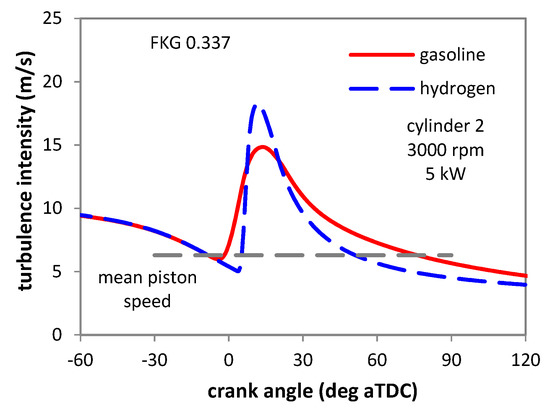 Predicted turbulence intensity for the two fuels at 3000 rpm and 5 kW brake power; mean piston speed is also indicated with a dashed line.
