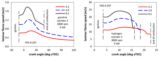 Figure 6 shows that predicted overall turbulence intensity was quite similar for both fuels; integral length scale was also practically the same. Therefore, the turbulence component in the process of flame propagation should be relatively the same. Laminar flame speed, on the other hand, is over an order of magnitude higher for H2 at reference conditions. As Figure 7 shows, this results in SL values in the range of 10–25 m/s, compared to 0.4–1.6. Apart from the wider range in terms of relative values (around 3–4 times from minimum to maximum DEM during combustion for gasoline, compared to around 2 for H2), the fact that the absolute SL is significantly lower for the liquid fuel means that the influence on in-cylinder pressure is much more pronounced in terms of overall combustion duration. On the contrary, for the gaseous fuel, overall ‘fast’ combustion means that there is less influence of the chemistry part of the process. As detailed in a previous study [21], there is a certain laminar flame speed threshold above which the actual influence on combustion is no longer as evident. Of course, other phenomena such as increased heat loss may result in unwanted effects such as local hotspots, but in terms of an actual link to the thermodynamics of the process, there is less evidence of a connection.