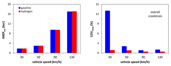 Figure 8 shows the IMEP and COVimep predicted in conditions of constant driving speed at 30, 50, 90, and 130 km/h. The power output was practically the same for both fuels (slight differences, below 1%, were due to the various stable conditions reached by the PID controllers for each operating point), while predicted variability was quite different. For the 30 km/h case, the model predicted a COVimep of over 12% for gasoline, close to the 10% limit considered as the threshold for acceptable engine output variability in automotive applications [39]; of course, continuous driving at 30 km/h is seldom encountered, as at such low speed, start/stop vehicle use due to traffic is more likely. As the engine load increases, less residual gas is present in the cylinder; thus, the related variability is less evident. For 130 km/h, the predicted COVimep was around 1.0% for the liquid fuel and 0.4% for H2. The absolute values are completely comparable to those recorded at similar load on an automotive SI engine [40], and the relative difference between the two fuels is also directly analogous. These results give further confidence to the analysis in terms of the capability of predicting the effects of hydrogen on CCV.