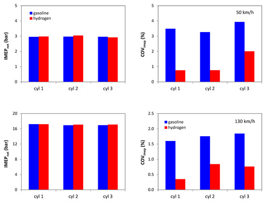 If, for gasoline, the cylinder-to-cylinder IMEP variation was below 1% at 50 km/h, with H2, this parameter was close to 4%; at 30 km/h, the difference was even more prominent, at over 10%. Somewhat counter-intuitively, the situation was the opposite for the 130 km/h case, for which gasoline featured the higher figure. This further highlights particular aspects that would normally be neglected (e.g., with gasoline fueling) but that may become important with H2. Cylinder imbalance was indeed identified as a possible issue [23] which results in different volumetric efficiency for each cylinder. Even if this parameter was overall around 26.5% for the 50 km/h case, the individual volumetric efficiency was 25.7, 26.3, and 27.5% for cylinders 1, 2, and 3, respectively; this is the main reason for the predicted relative air–fuel ratios of 0.91, 0.97, and 1.09 at cycle start (exhaust lambda was instead close to stoichiometric). As a consequence, the COVimep of cylinder 3 was more than twice that of the other two cylinders. Interestingly enough, the situation is not exactly the same for the 130 km/h case, for which cylinder 2 featured the highest variability when using hydrogen.