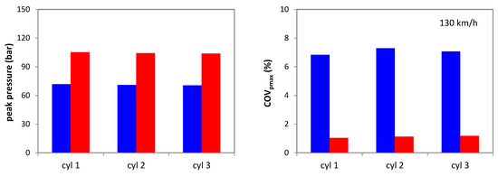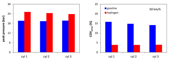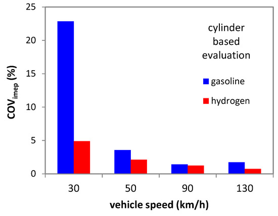 One other reason for concern is that peak pressure tends to be higher when using hydrogen. The main reason is its ‘faster’ combustion; lower volumetric efficiency requires higher boost levels and thus further contributes to an increase in peak pressure. If at low load this is not a problem (e.g., an increase from around 20 to 25 bar at 50 km/h), at high load this could become an issue. As shown in Figure 11, at 130 km/h, predicted peak pressure was around 70 bar when using gasoline, while with H2 it was over 100 bar. This increase of close to 50% could push the operating regime beyond the limit usually employed for containing peak pressure during the working cycle. Just as for the IMEP data, COVpmax was much lower for the gaseous fuel. The fact that hydrogen features such high laminar flame speed practically eliminates the influence of the FKG parameter and thus greatly reduces variability.