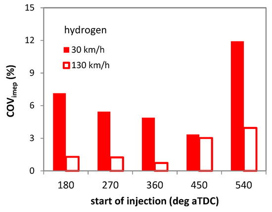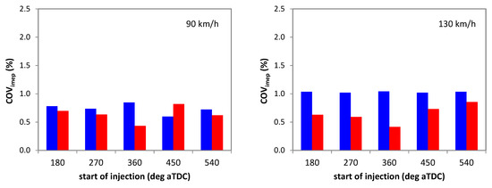 Figure 14 shows the results obtained by extending the population of IMEP values to all three cylinders. While the overall trend is very much the same as that shown in Figure 13 (with SOI360 ensuring a good compromise for all vehicle speed cases), the higher values emphasize the effect of injection phasing on COVimep. One interesting result is that for 30 km/h cruising speed, the model predicted better stability with SOI at 450 deg aTDC. Given the reduced injection duration (below 1 ms), fuel delivery is completed during the intake stroke, even with relatively retarded SOI. For 130 km/h, the best choice was predicted to be SOI 360 deg aTDC; the end of injection was before intake valve closure (IVC) for this case as well (injection duration was slightly below 5 ms).