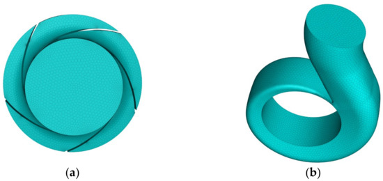FLUENT MESHING was selected for mesh generation and optimization. Considering the twisted blades and wide flow path of the high-speed centrifugal pump, the hexahedral mesh is chosen for the impeller subdomain. For the other subdomains, the hexahedral structured mesh is adopted. The quality of all grids is above 0.31, which can meet the requirements of subsequent numerical calculations. The grids of the impeller and volute are shown in Figure 3.