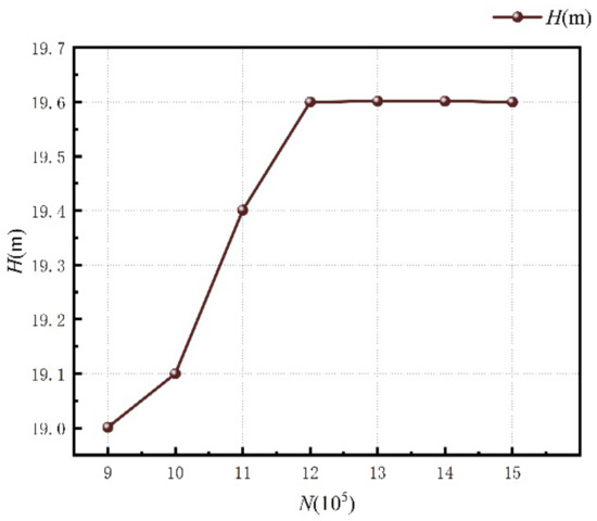 In order to reduce the influence of the grid numbers on the numerical results, grid-independent analysis was conducted. The head of the centrifugal pump at a flow rate of 1000 m3/h was used as an indicator. As depicted in Figure 4, the pump head no longer varies significantly when the total number of grids is greater than 1.2 million. Thus, the final total number of grids was determined to be 1.2 million. The grid numbers of impeller, volute, inlet straight pipe section and outlet straight pipe section were 469,873, 554,281, 1,250,810 and 67,000, respectively.
