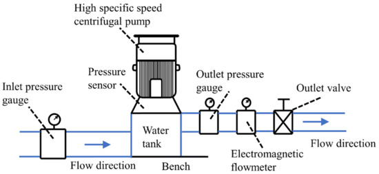The performance tests with different impellers, which have three and six blades, were carried out on a comprehensive experimental platform with Class II accuracy. The test bench is depicted in Figure 5, with inlet and outlet valves, inlet and outlet pressure gauges, and pressure transducers being included. Measurement accuracy is 0.5% for electromagnetic flow meters and inlet and outlet pressure gauges. The data were collected and transferred to the computer, and the performance of the pump was calculated.
