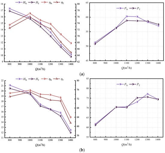 Comparison of performance between CFD prediction and experiment: (a) three-blade; (b) six-blade. Note: H, η and P represent head (m), efficiency (%) and power (kw), respectively. Subscripts N and T represent numerical calculated value and test value, respectively.