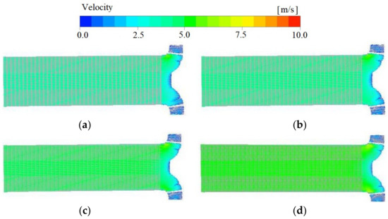 Relative velocity vectors in the axial section of the pump at different flow rates: (a) 800 m3/h; (b) 1000 m3/h; (c) 1100 m3/h; (d) 1300 m3/h.