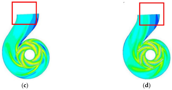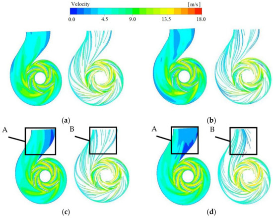 Velocity and streamline distribution of the volute at different flow rates: (a) 800 m3/h; (b)1000 m3/h; (c) 1100 m3/h; (d) 1300 m3/h.
