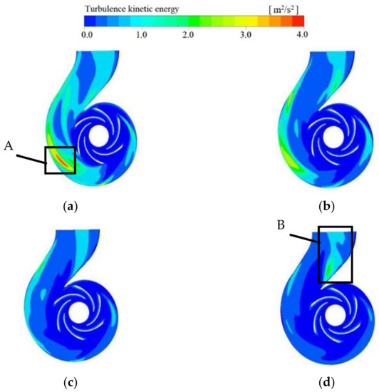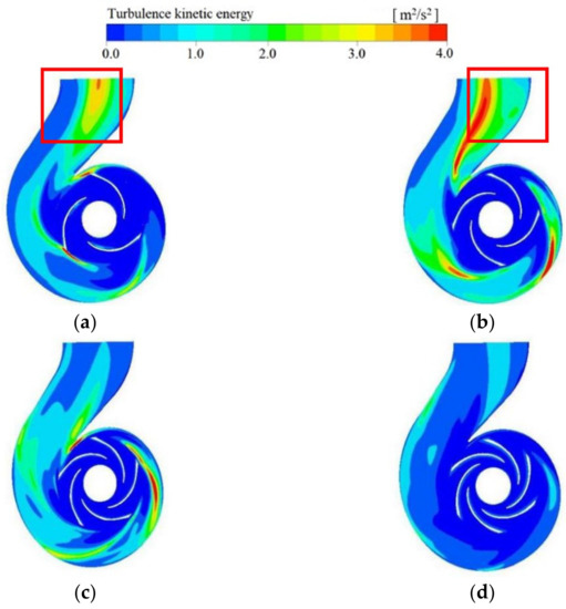 Turbulence kinetic energy in pump cross-section at different flow rates: (a) 800 m3/h; (b) 1000 m3/h; (c) 1100 m3/h; (d) 1300 m3/h.