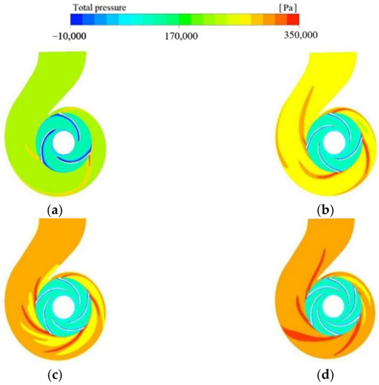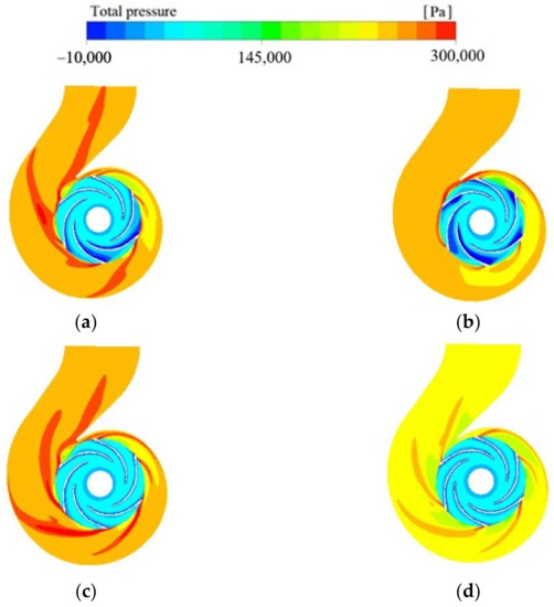 The total pressure in pump cross-section at different flow rates: (a) 800 m3/h; (b) 1000 m3/h; (c) 1100 m3/h; (d) 1300 m3/h.