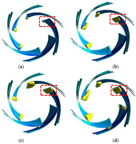 Cavitation distribution under different working conditions: (a) 500 m3/h; (b) 800 m3/h; (c) 1000 m3/h; (d) 1100 m3/h.