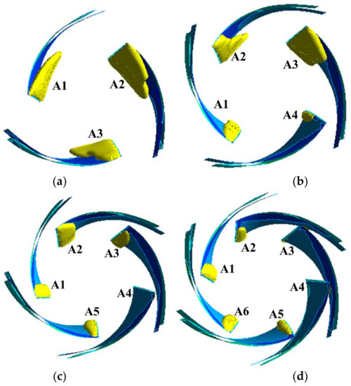 Cavitation volume distribution with different numbers of blades: (a) three-blade; (b) four-blade; (c) five-blade; (d) six-blade. Note: The setting angle of impeller blade inlet is 22°.