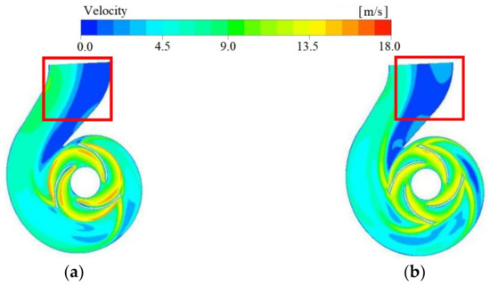 The velocity and flow distribution of the mid-section in the volute under different operating conditions is depicted in Figure 8. There is a high-speed area in the impeller flow channel, and it can be seen that the speed of the blade suction surface in the impeller flow channel is greater than the pressure surface. When the flow rate was increased, it was found that the range of velocity variation around the impeller was not very large. Under the flow conditions of 1100 and 1300 m3/h, the velocity distribution at the volute outlet is uneven. There is a low-speed zone at frame A, which expands from the right to the left with the increase in flow. The speed streamline in frame B is also gradually disordered. This shows that there is a trend of flow separation within the volute under large flow conditions, which may lead to further loss of energy.