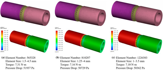 Grid independence tests were performed before the final number and size of the mesh were decided. An initial primitive (coarse-meshed) model typical of the formal simulation was first analyzed, with the results recorded. This was followed by a series of the same analyzing procedures on the re-meshed models with systematically refined elements until the recorded results from two consecutive analyses differed by within 1%. The number and size of the mesh of the last analysis were adopted in the formal simulation. A typical grid independence test for the more complicated CFD analysis is hereby presented in Figure 3 to illustrate the grid independence test procedure undertaken by both the mechanical and fluid dynamics simulations. It can be seen from Figure 3 that further refining of the grids will no longer produce significantly different results. Therefore, the grid number and size can be adopted for the formal simulation.