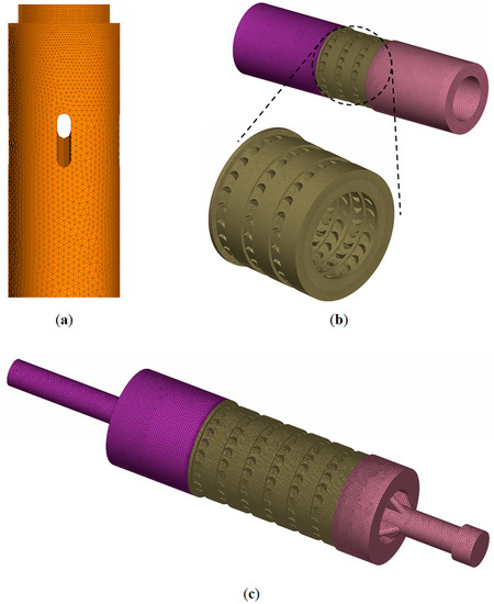 Meshing of the models: (a) meshing of the shaft model; (b) meshing of the fluid domain of the three-stage turbine; (c) meshing of the fluid domain of the whole-set DFDR model.