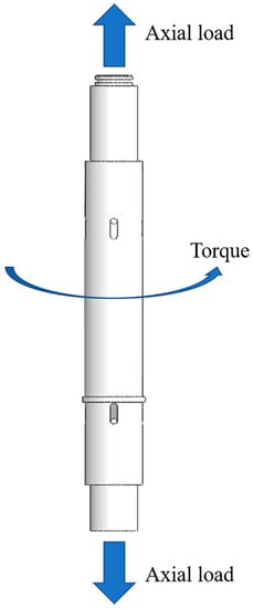 As the main load-bearing part of the DFDR, the shaft mainly bears axial loads and torques, as shown in Figure 5. As mentioned earlier, potential tensile failure can occur on the shaft of the DFDR, causing serious downhole problems. Considering the current state of URHW drilling in the Chunliang District of the Shengli Oilfield, it is expected that 30 DFDRs should be incorporated within a flexible string to generate usable torque. However, in the simulation, to emulate more severe conditions, a safety factor of 1.5 was adopted, so 45 DFDRs should be considered. When a DFDR string is sent downhole or lifted out of the hole, the string is suspended, and the shaft of the uppermost DFDR bears an axial load equal to the weight of the entire flexible string. Therefore, in the tensile simulation, one end of the shaft model was set to “fixed”, and a 6.70 kN axial outward load (corresponding to the weight of 45 DFDRs) was applied to the other end as the boundary condition.