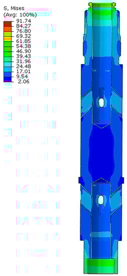 The mechanical simulation results are shown in Figure 6. It can be seen from the equivalent stress (von Mises stress) contour that higher stresses were distributed mainly on the pipe structures of the shaft, especially at the ends of the pipes. In contrast, the solid middle part of the shaft had low stress. Such a distribution of stress is in accordance with fieldwork failure cases where most fractures occur at the joints of neighboring flexible drill rods, leading to the breaking-off of the flexible drill strings. According to the simulation results, under a weight load of 45 DFDRs, no area within the shaft showed a stress that was significantly close to the yield strength. The maximum stress reached was 91.74 MPa which is far less than the material’s yield strength of 930 MPa. This indicates that the drilling operation under the 30-DFDR scenario has a very small chance of encountering a tensile failure.